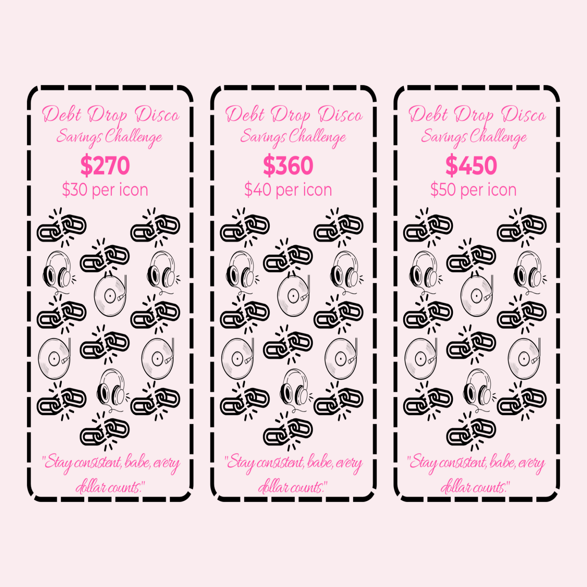 How It Works: Make big moves on your debt with these disco-themed trackers! Start with $270 and build up to $450. The fun, energetic design keeps you motivated to tackle larger debt amounts with confidence and style.