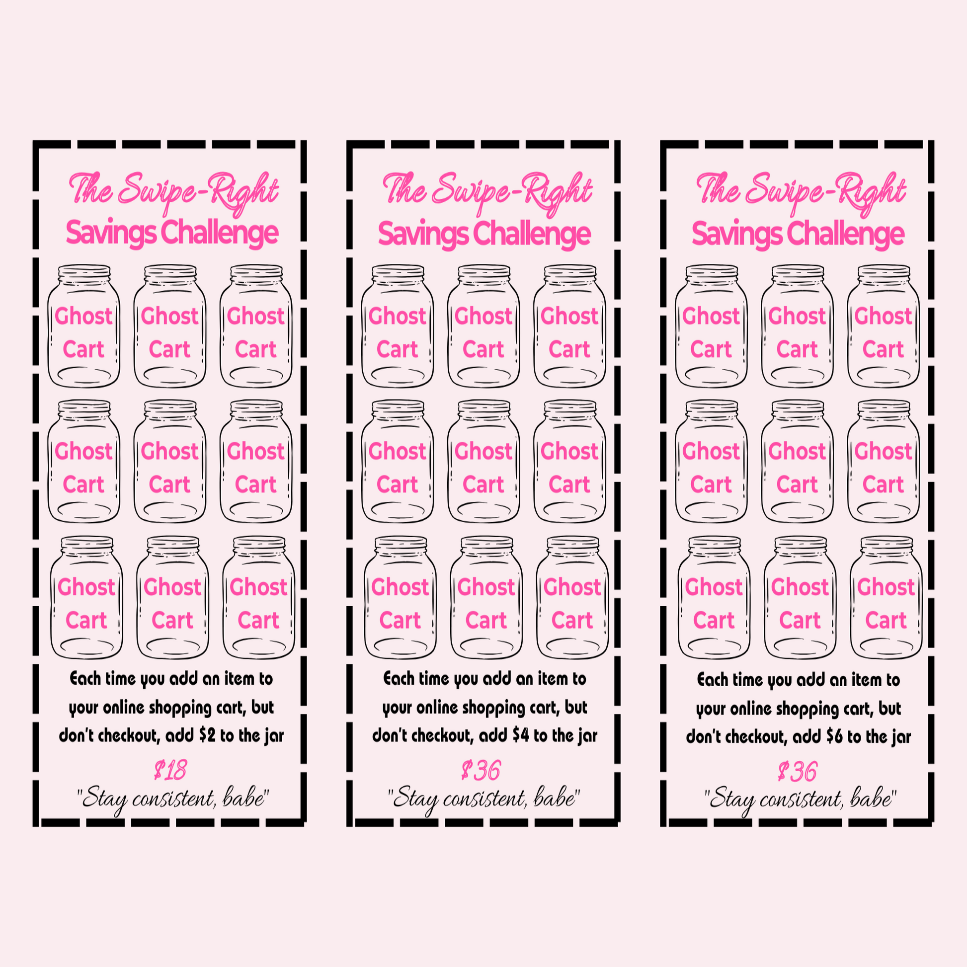 Swipe right on savings, not shopping! Break your online shopping habit with this genius challenge - every time you abandon your cart, save that money instead! 6 progressive trackers help you turn impulse shopping into serious savings.